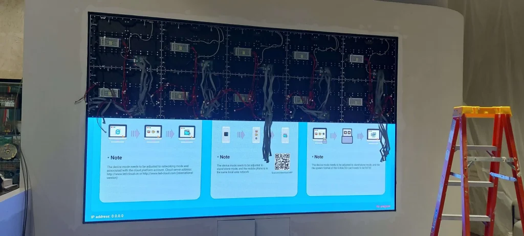 - Completion of cabinet installation, module assembly, receiver card installation, power connections, and network cabling.